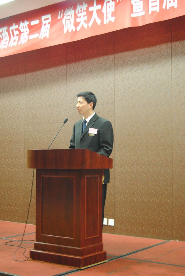 演讲活动在工程部电工童湘红的《让服务从微笑开始》中正式拉开,质朴的话语,扣人心弦工作感悟,让人感到真实自然。随后酒店仓管、客房楼层领班和服务员、前台接待领班和接待员、销售部领班和员工、酒店洗衣房/PA主管和PA员工、财务部收银员、餐饮领班和服务员、信息中心领班等不同岗点的微笑大使候选人计二十一人顺次走上讲台,细述工作中的点滴,讲述生活中的故事,阐释对微笑服务的感悟。《微笑服务无处不在》、《用微笑挑战自我》、《微笑迎客,世界随你微笑》、《让微笑滋润你的心田》、《平凡岗位,微笑面对》、《微笑中服务》《做一名优秀的员工,做一个优秀的人》、《我微笑是为了您的微笑》、《把诚挚的微笑渗透到每一个环节》、《微笑吧!你会很棒》……一首首优美的诗篇满载着自信激情迸发:“微笑是化解客人不满的良药”、“用微笑换取微笑,用心打动心”、“世界以痛吻我,我要报之以笑”“笑迎天下客,满意在我家”……微笑它像有种神奇的魔力,感染着酒店的每一位员工,引领着他们向客人传递酒店的温馨和关爱,展示酒店的独特魅力,在这一位位可爱的微笑使者的带动下,微笑已渗透到酒店的每一个角落,成为东台国际大酒店一张闪亮名片。