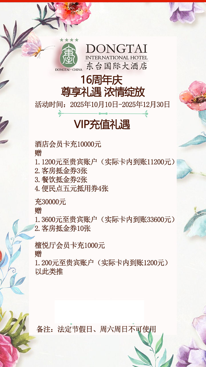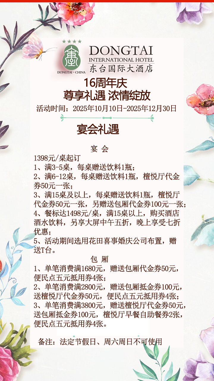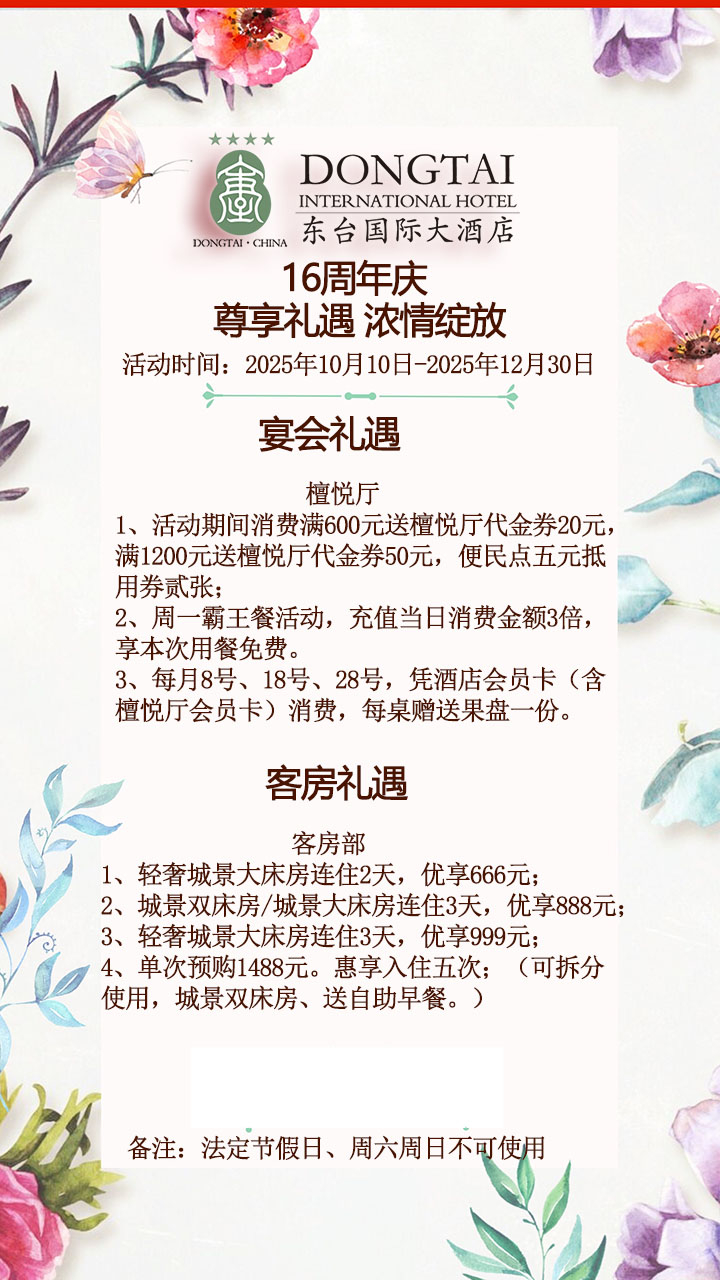 地址:江苏省东台市金海中路2号 邮编:224220 酒店总机:0515-89566666 餐饮预订:0515-89566666